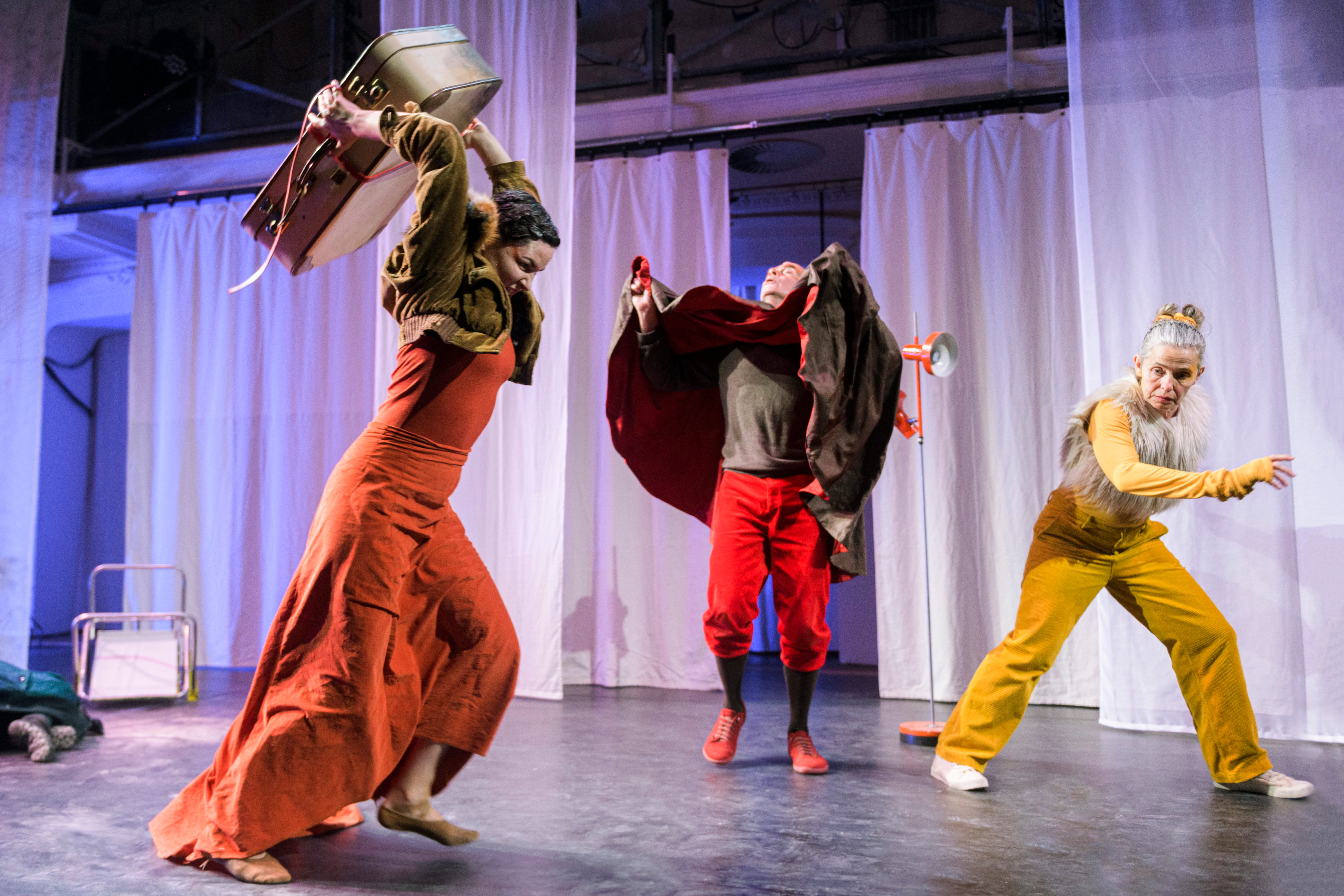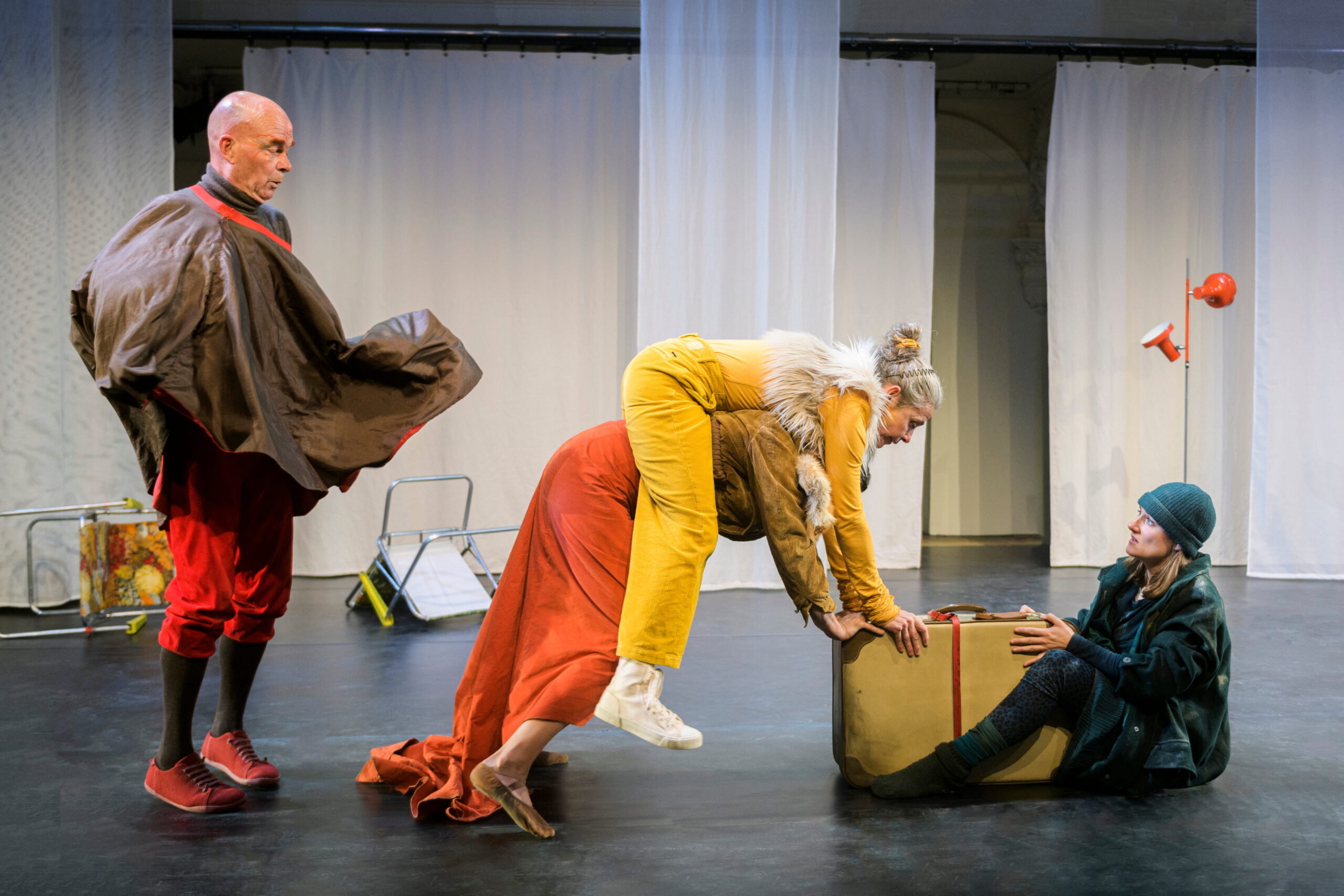 Eines Tages, wie aus dem Nichts, taucht es auf: das müde und staubige Wesen. Einen Koffer vor sich herschiebend, begegnet es Hase, Vogel und Fuchs, die gerade zufällig in der Nähe sind. Misstrauisch und neugierig zugleich beobachten sie das fremde Wesen. Wo kommt es her? Was will es hier? Doch ihr größtes Interesse gilt dem Koffer. Was befindet sich wohl darin? Eine Tasse, ein Tisch, ein Stuhl und eine kleine Teeküche, gibt das Wesen zur Antwort, bevor es vor lauter Erschöpfung einschläft. Unmöglich!, sind sich die Drei einig und machen sich in Nullkommanichts über den Koffer her. Antonia Brix’ Inszenierung folgt dem Bilderbuch des britischen Autors Chris Naylor-Ballesteros und kommt ebenso wie die Vorlage mit nur wenigen Sätzen aus. Die vier Schauspieler*innen erzählen über starke atmosphärische Bilder und poetisch verspielte Klänge vom Fremdsein und Ankommen, vom Fehlermachen und von der Kraft des Verzeihens.