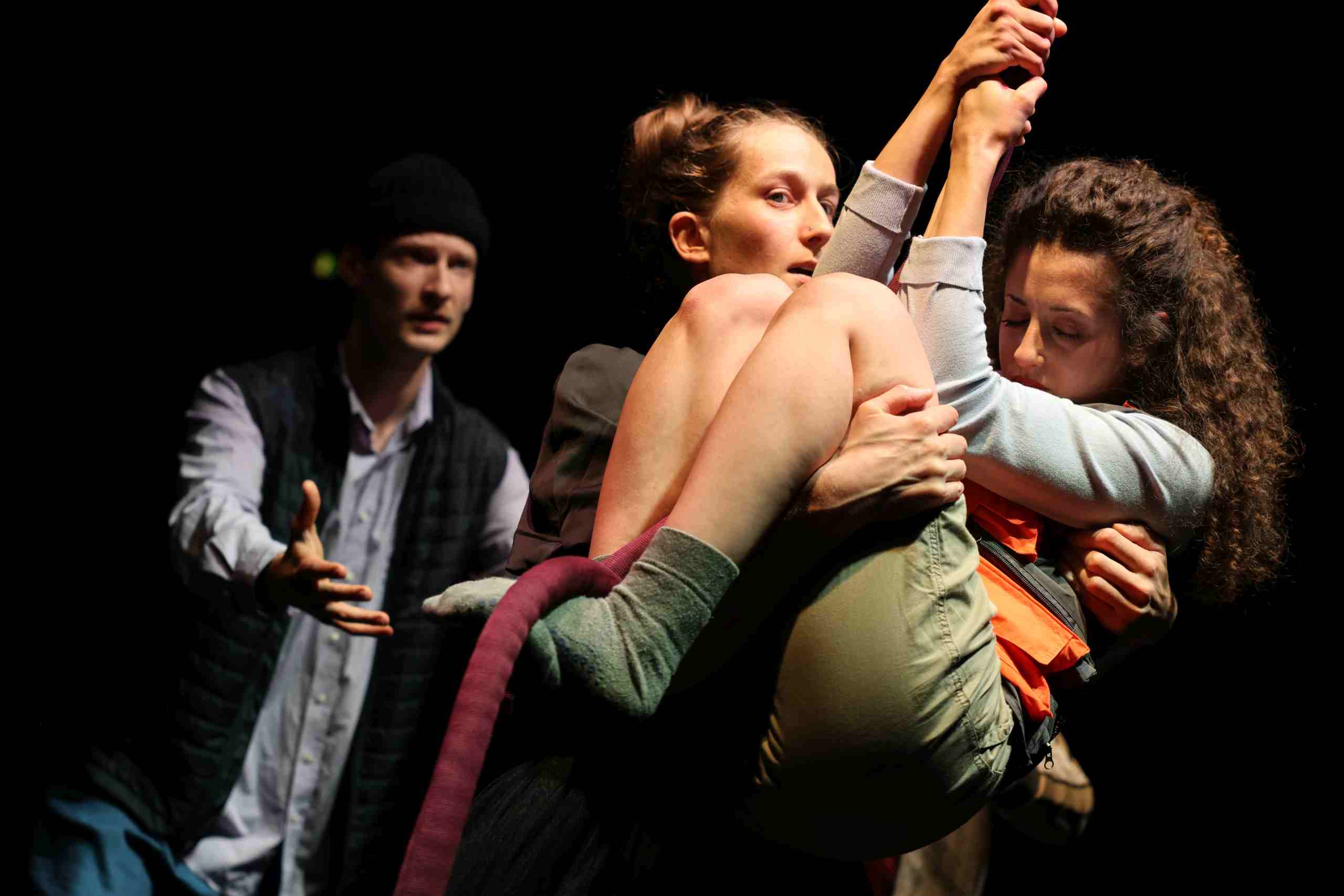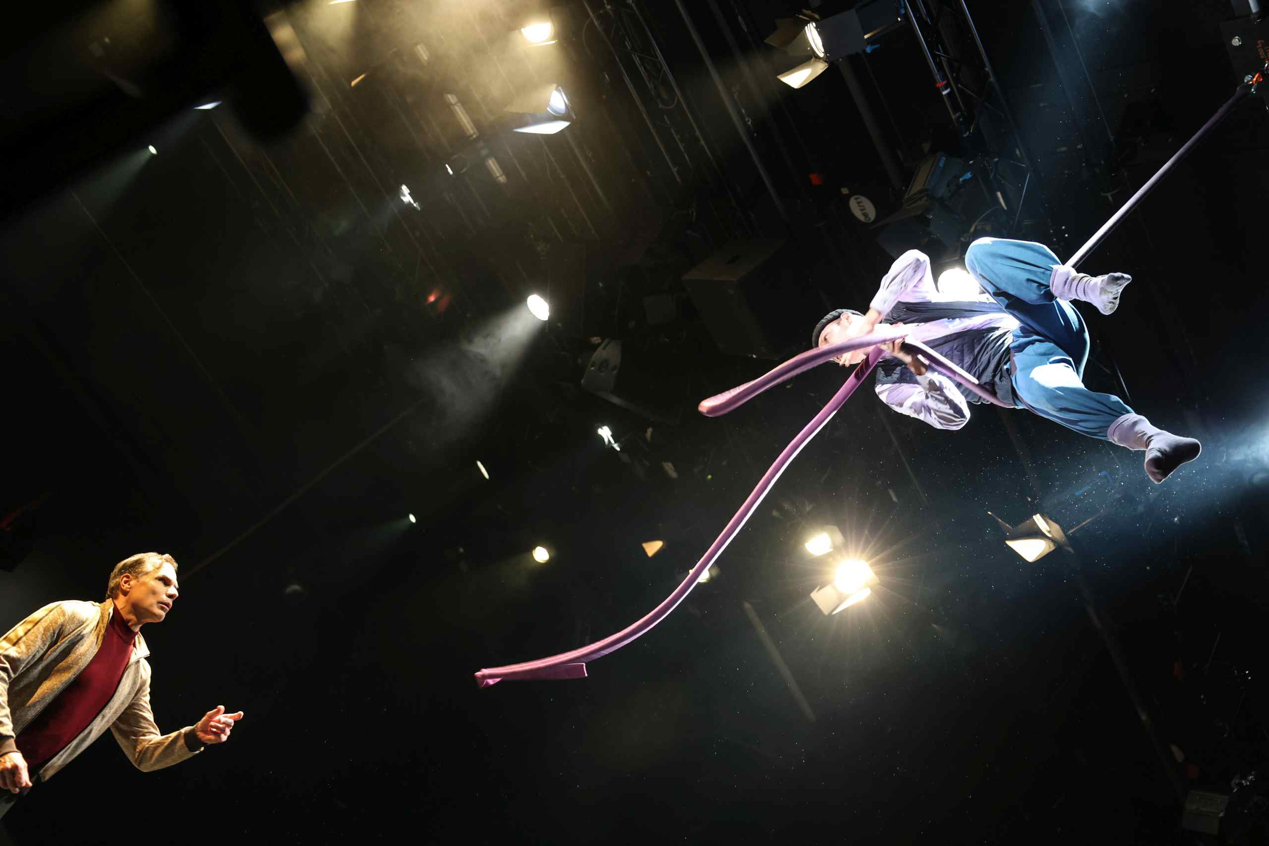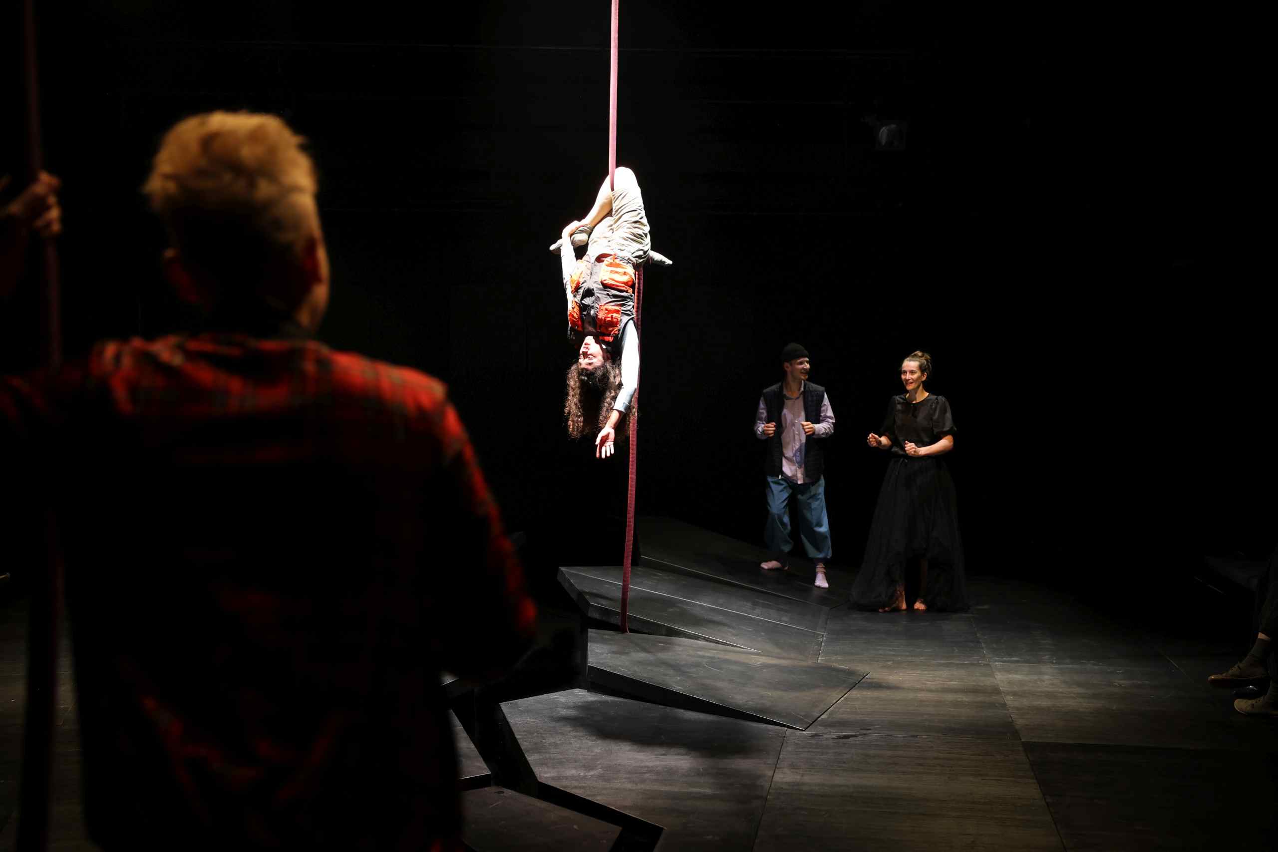 – Einige Schauspieler*innen hängen sich an Seilen auf und führen gefährlich wirkende Luftakrobatik vor.