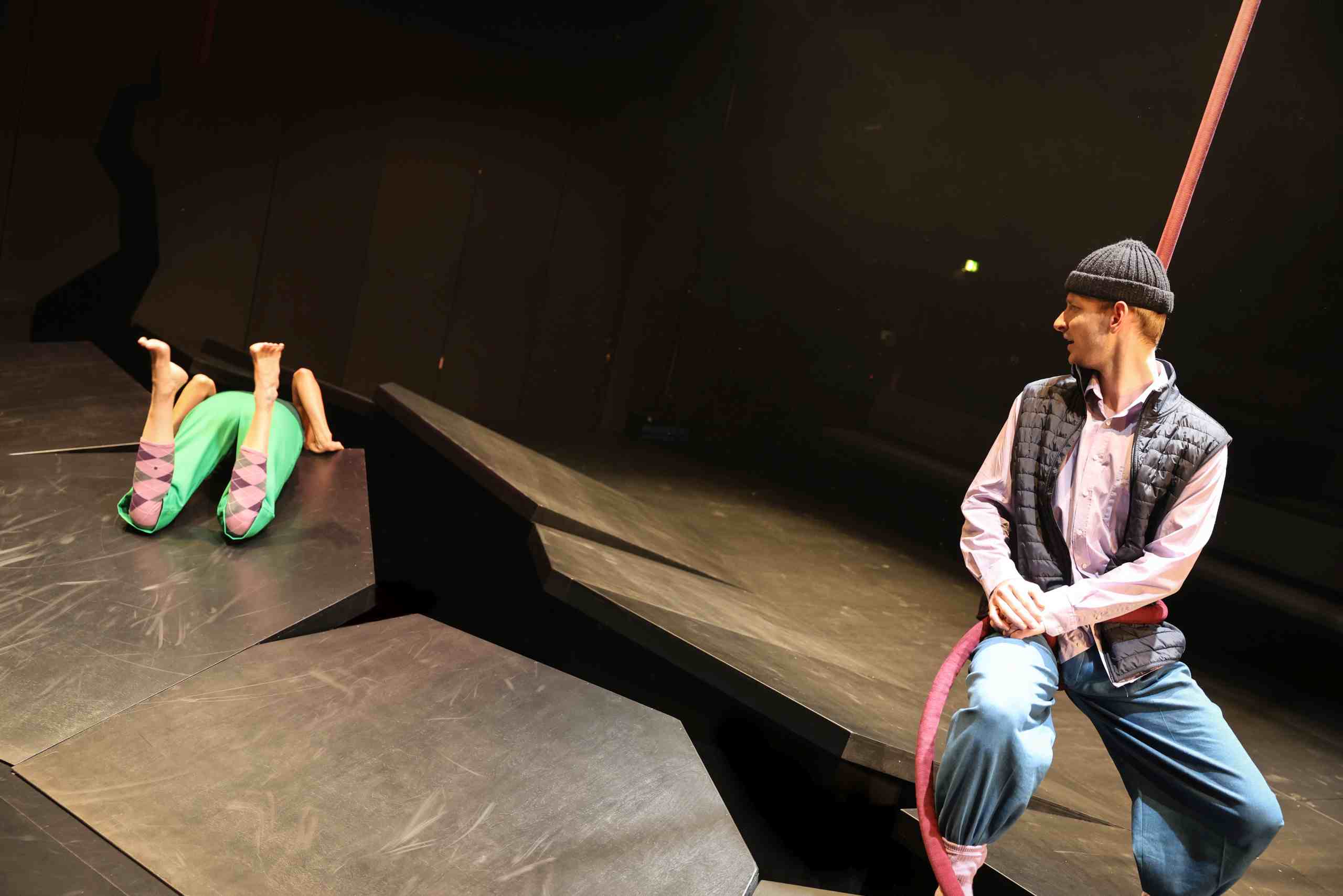 Zwei Artistinnen machen bei dem Stück mit. Sie zeigen Akrobatik in der Luft.