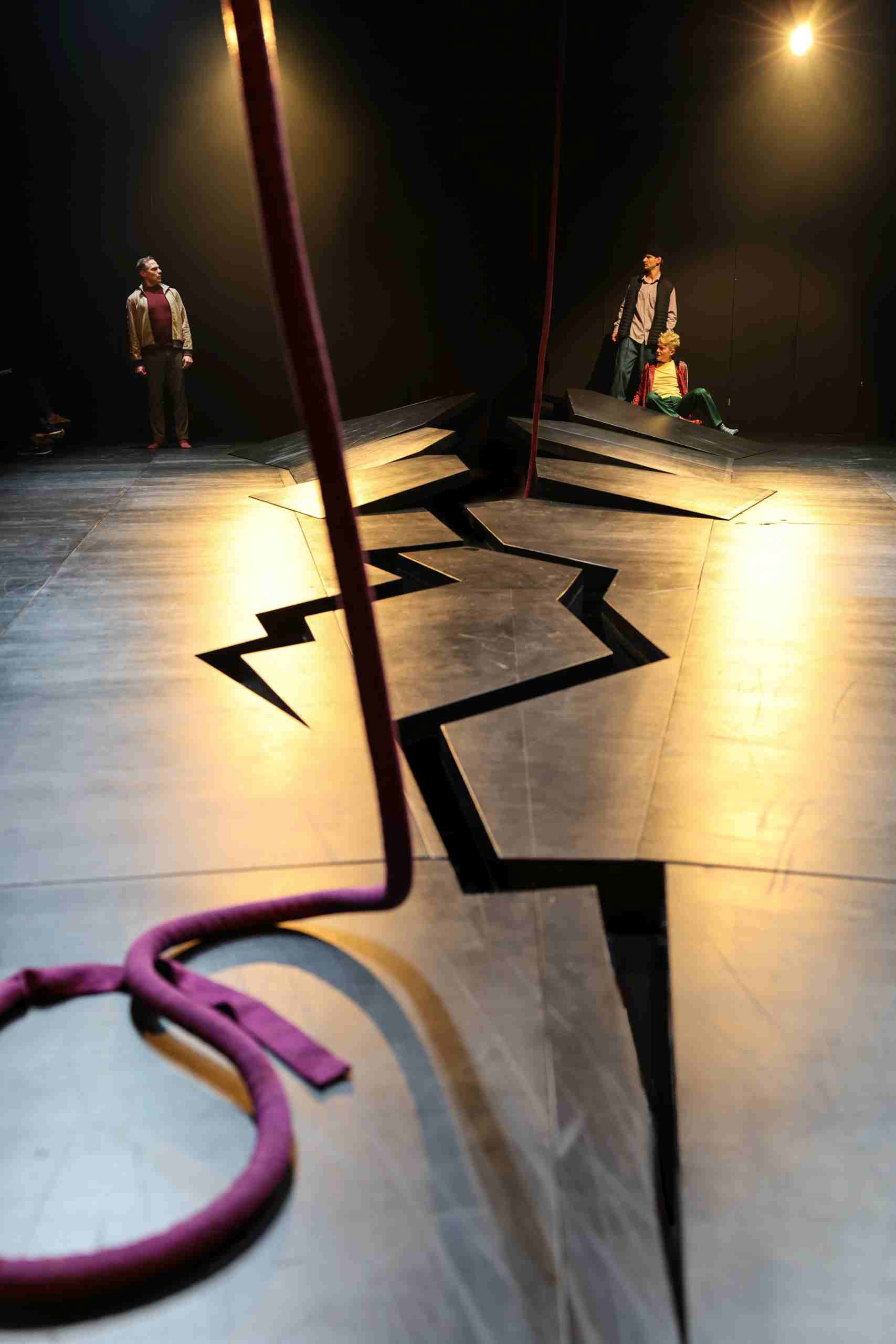 – In der Mitte der Bühne befindet sich ein großer Riss im Boden, der sehr tief zu sein scheint und durch den die Schauspieler*innen verschwinden und wieder auftauchen.